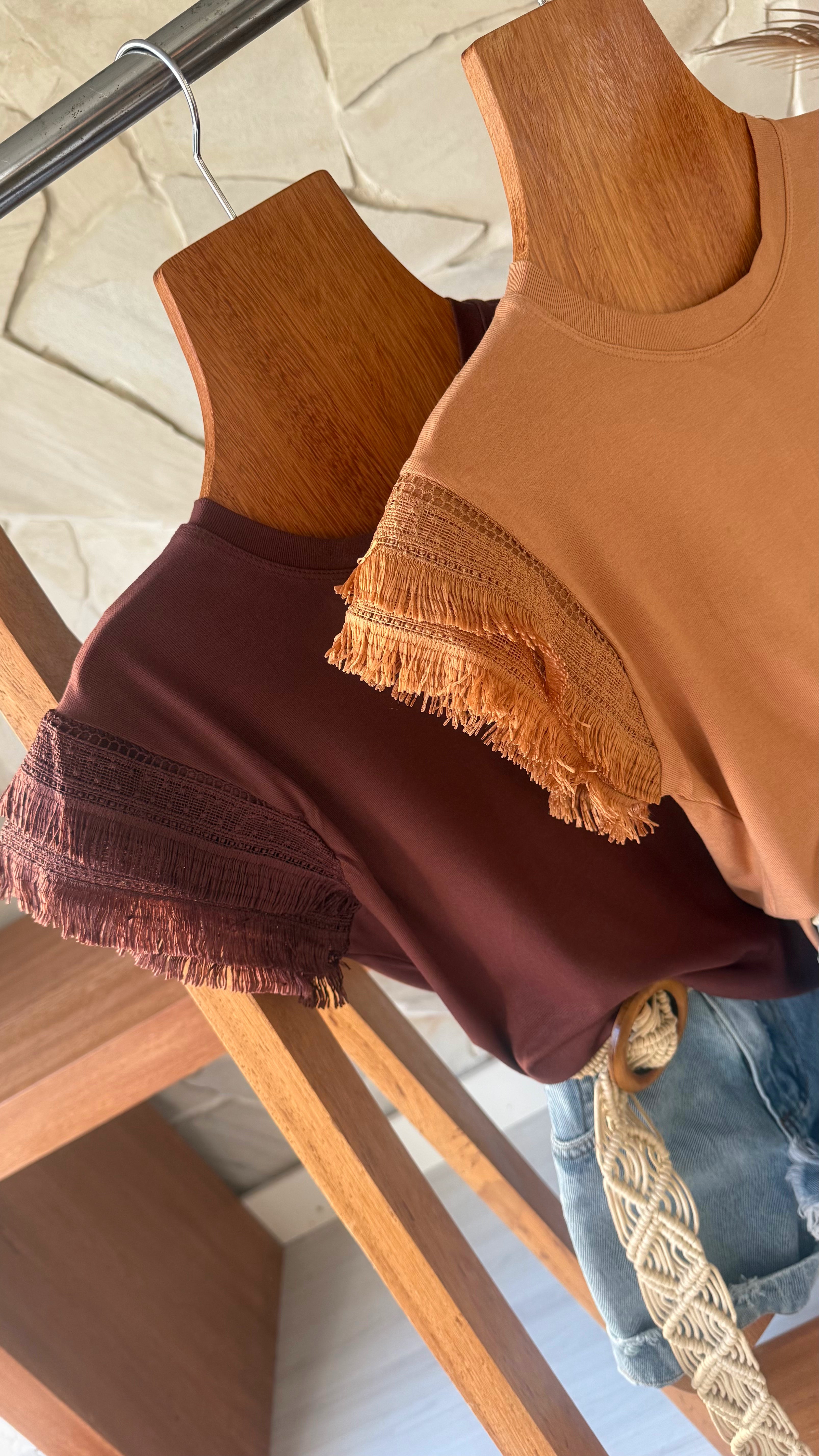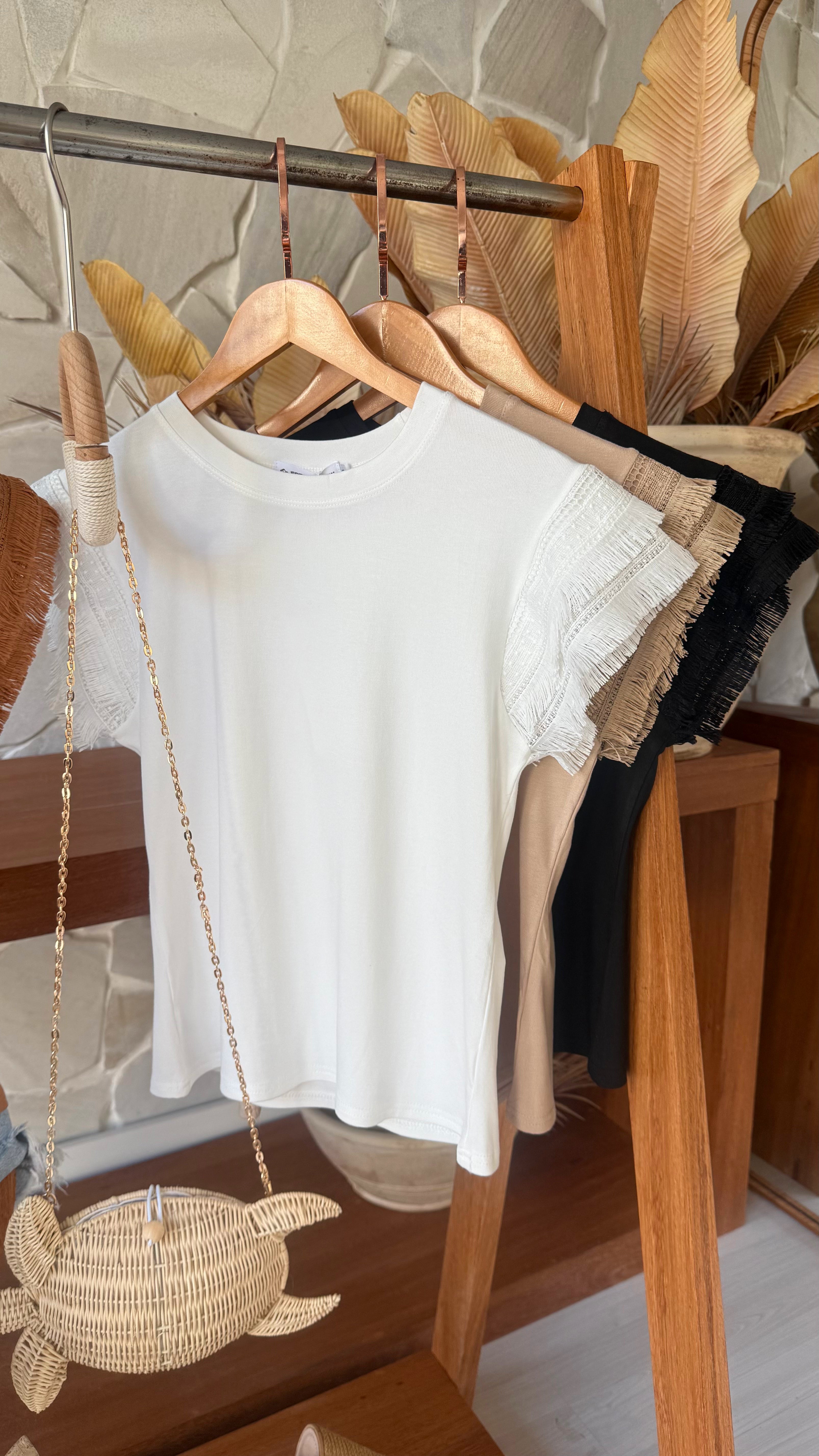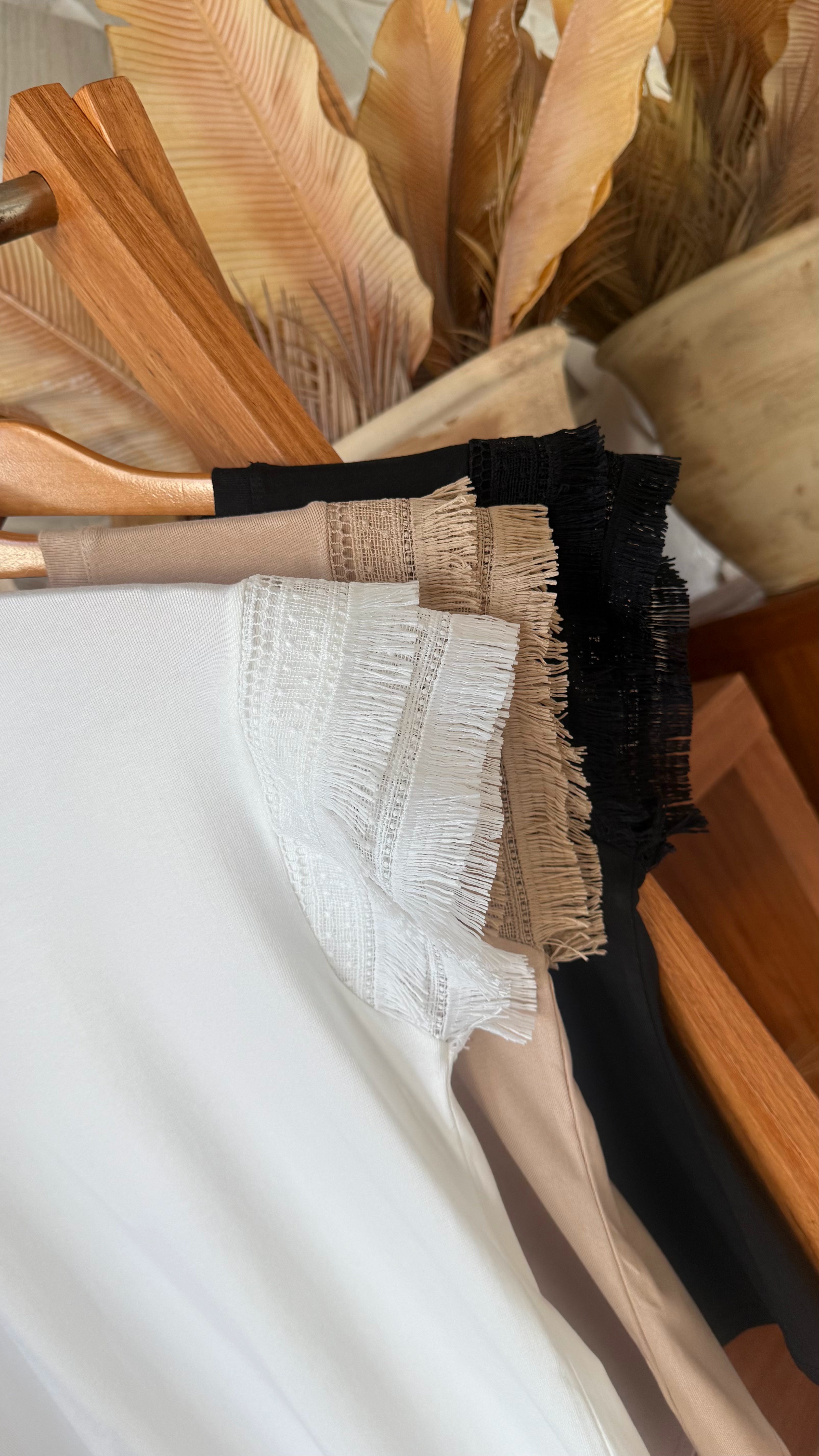 Blusa em malha especial, Textura macia, com leve elasticidade, encorpada, detalhes na manga em crochê. Peça indispensável para o dia a dia.