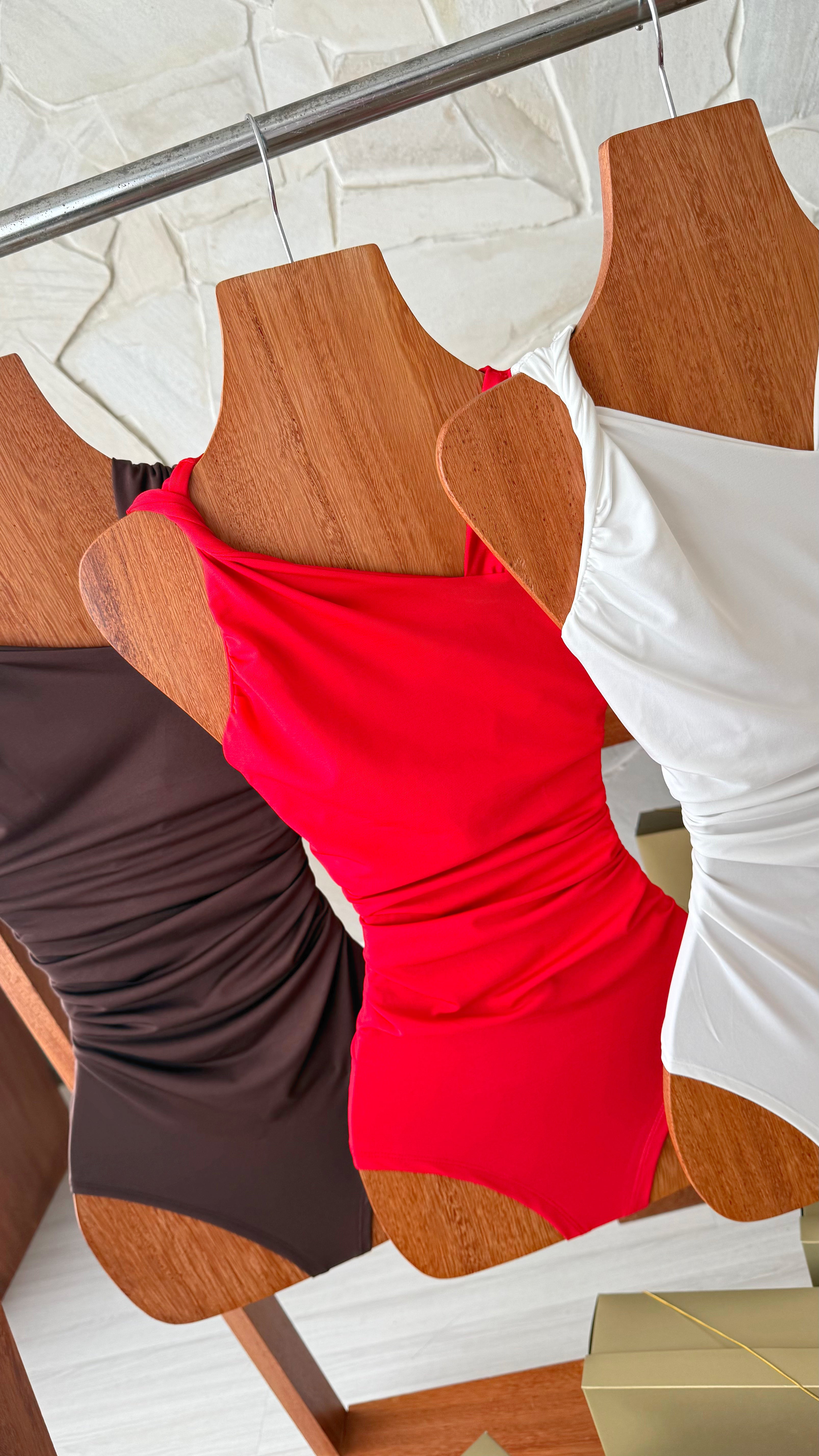 Modelo com tecido duplo e encorpado, não possui bojo. Cinturado e fechamento em colchete.