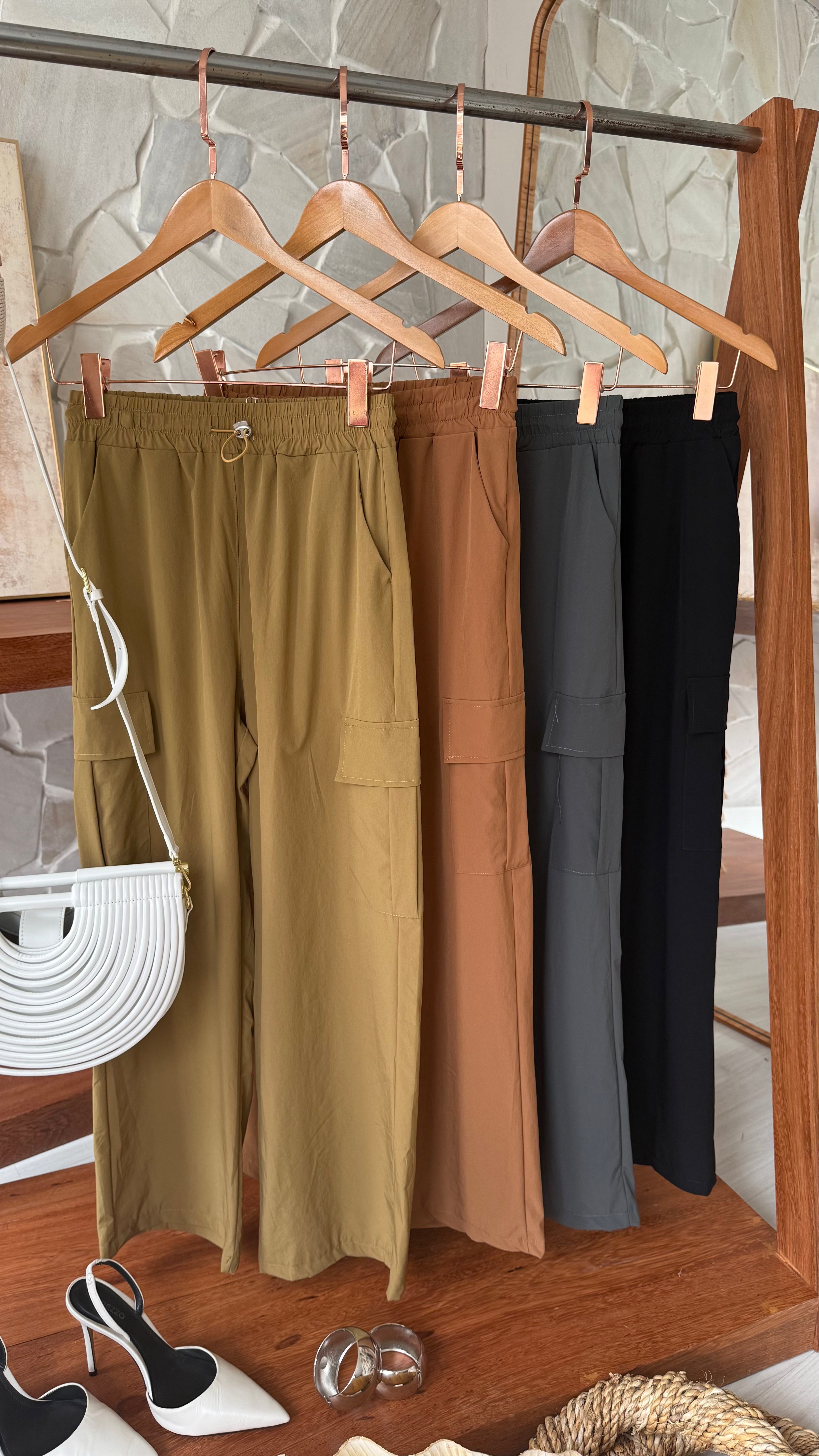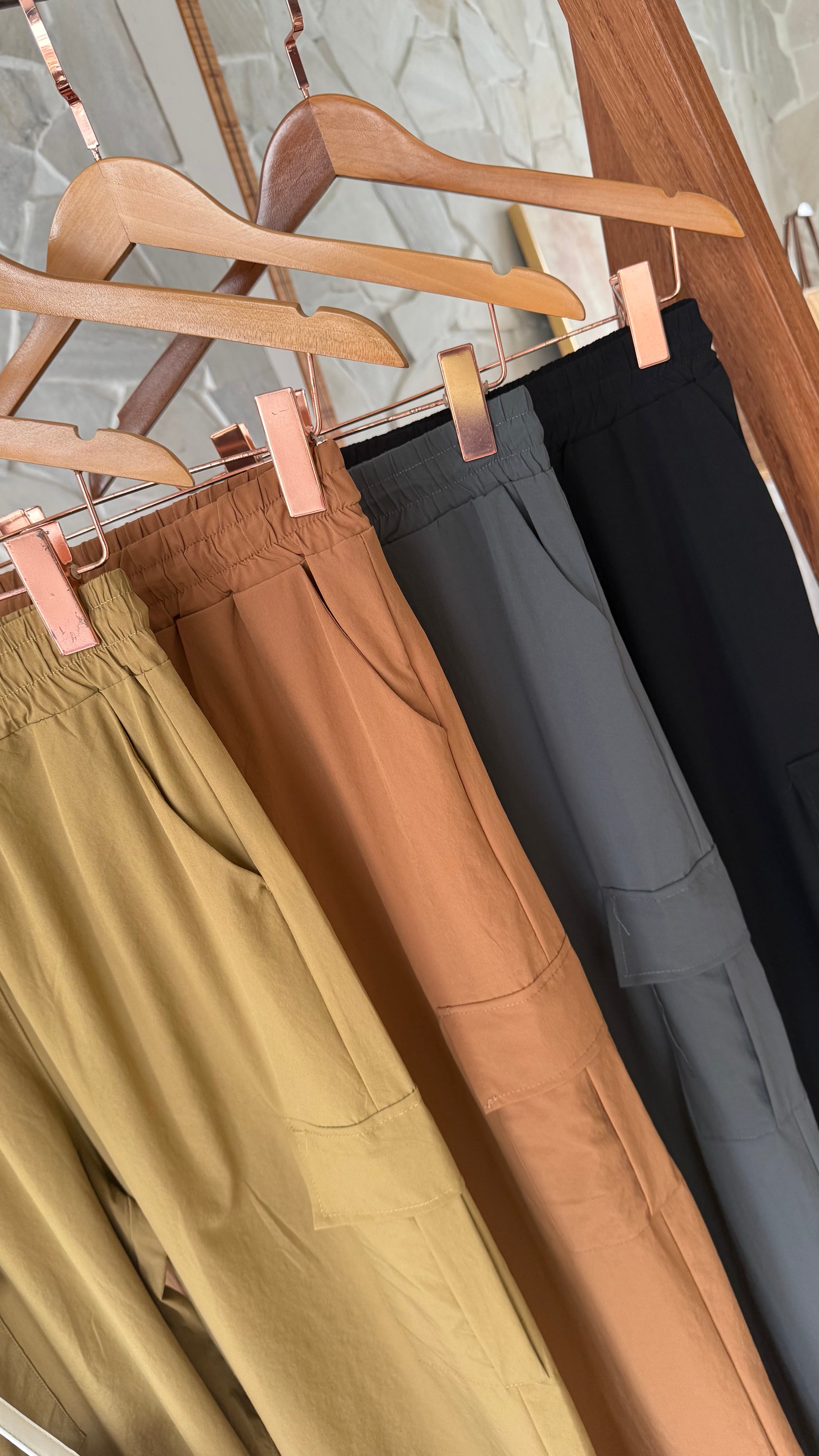 Modelo cargo, com bolsos laterais espaçosos, elástico na cintura e regulagem.