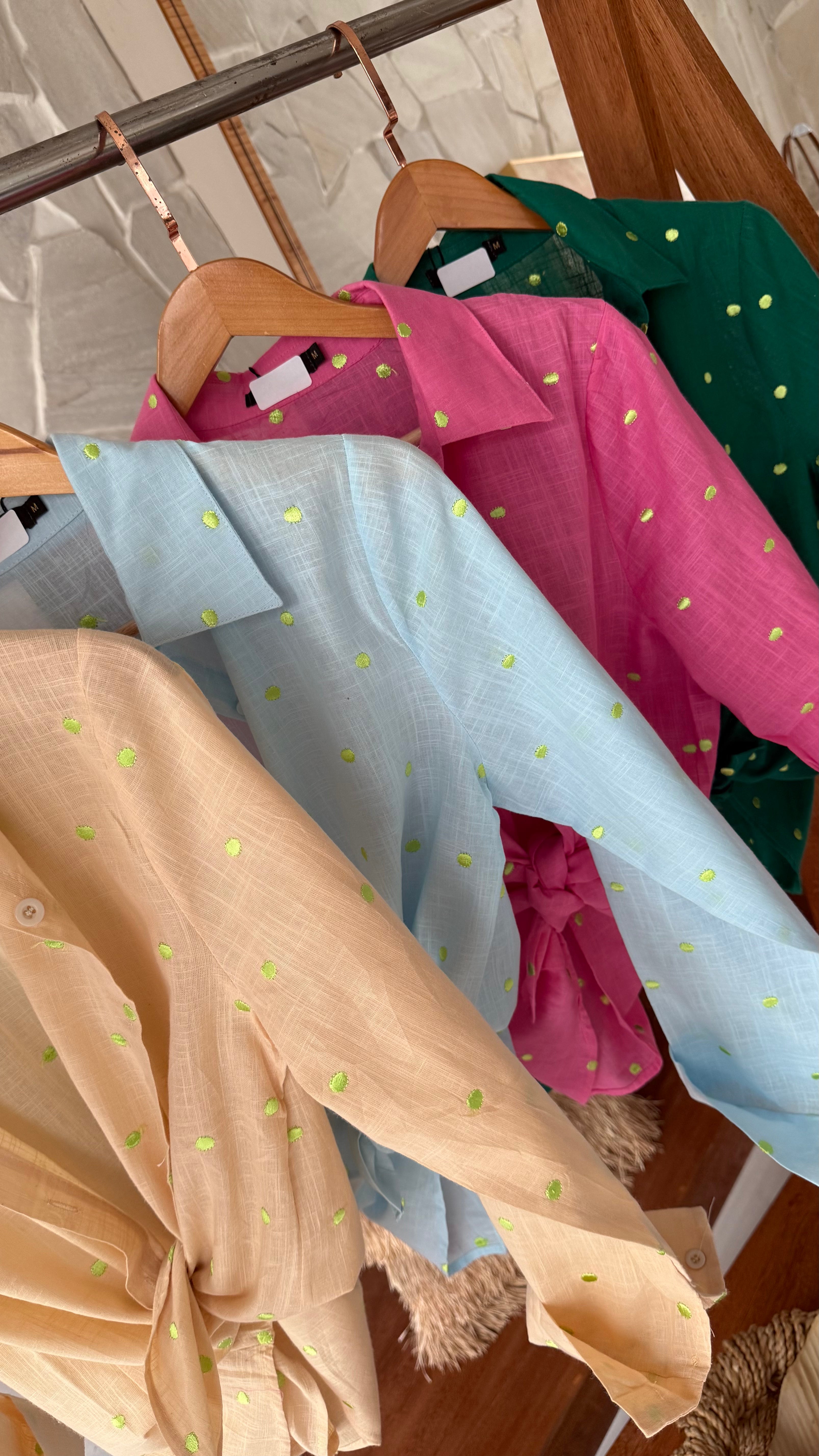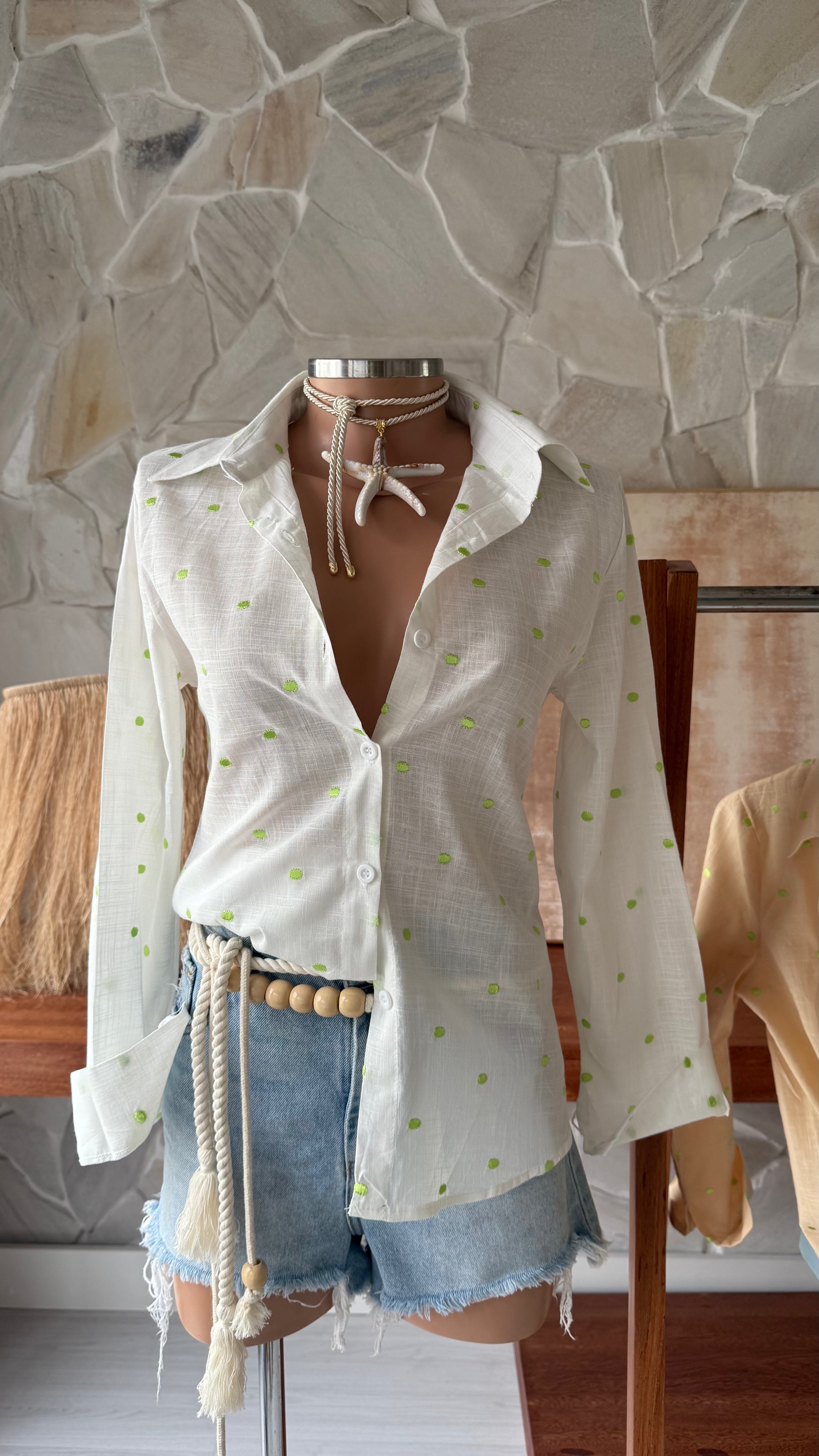 Camisa em tecido leve e sofisticado, com caimento fluido que garante conforto e elegância. Possui gola clássica, mangas longas com punho e fechamento por botões frontais. O detalhe do poá verticais traz um charme moderno. Versátil, pode ser usada em composições casuais ou mais formais , combinando perfeitamente com saias, calças ou shorts.