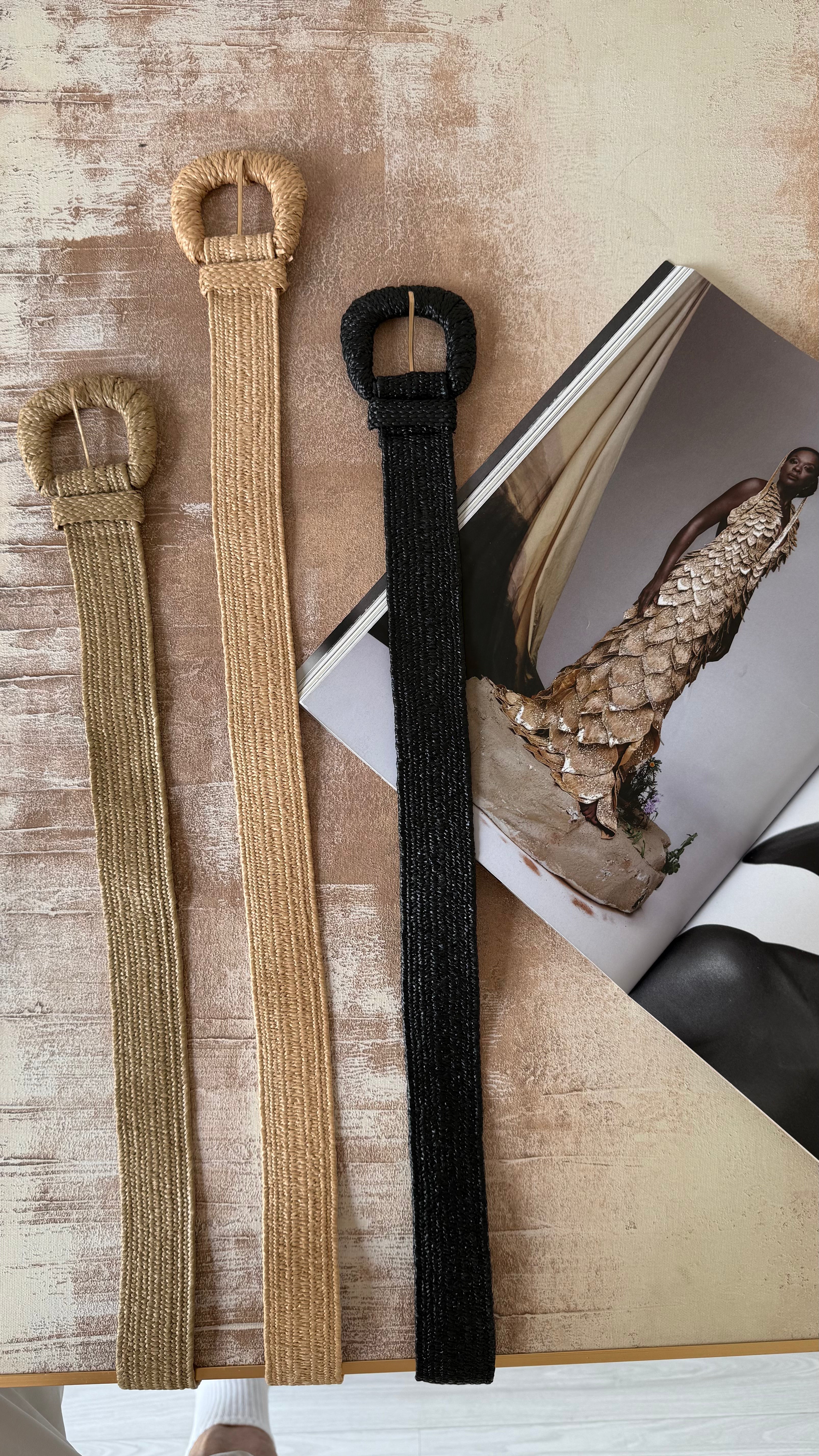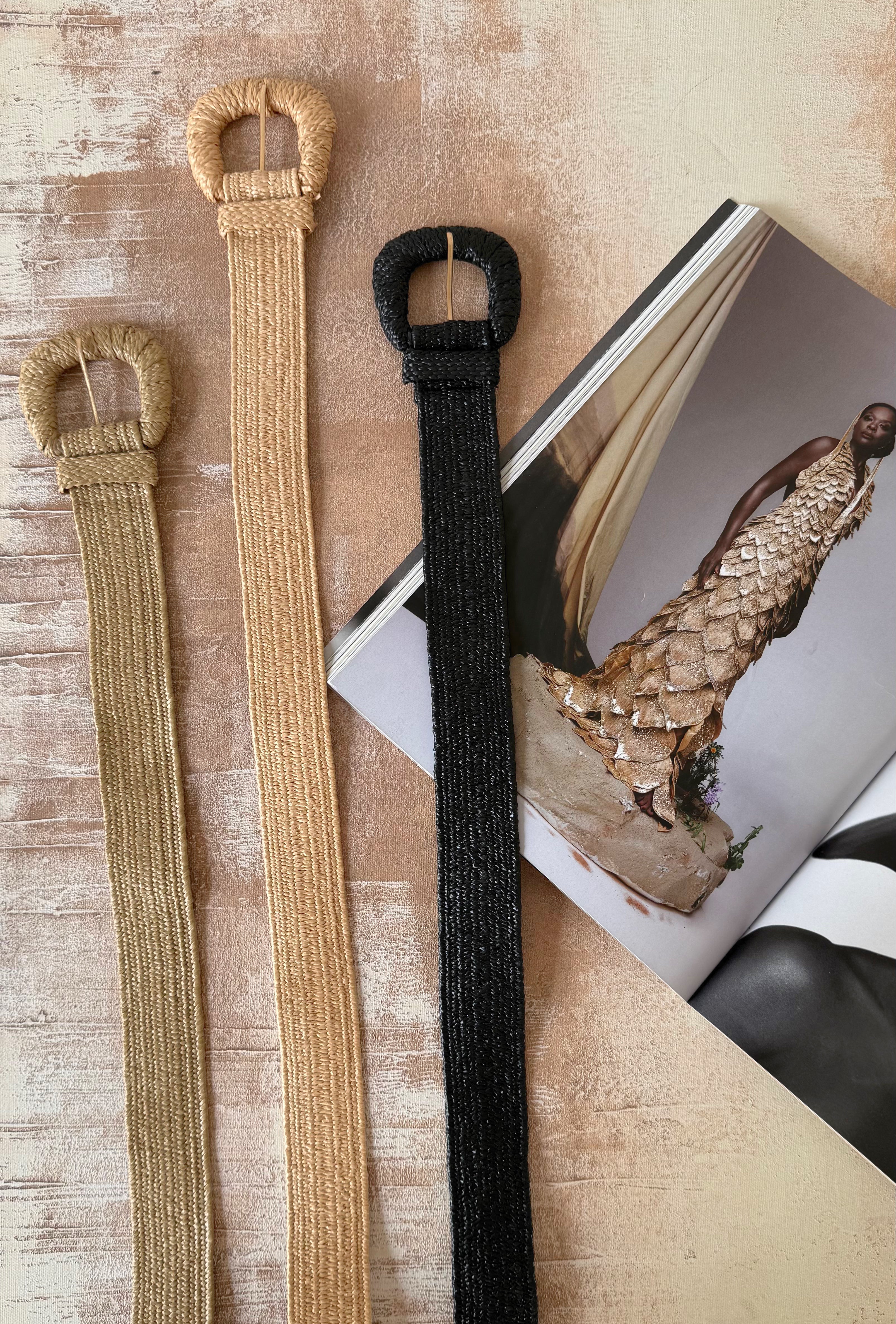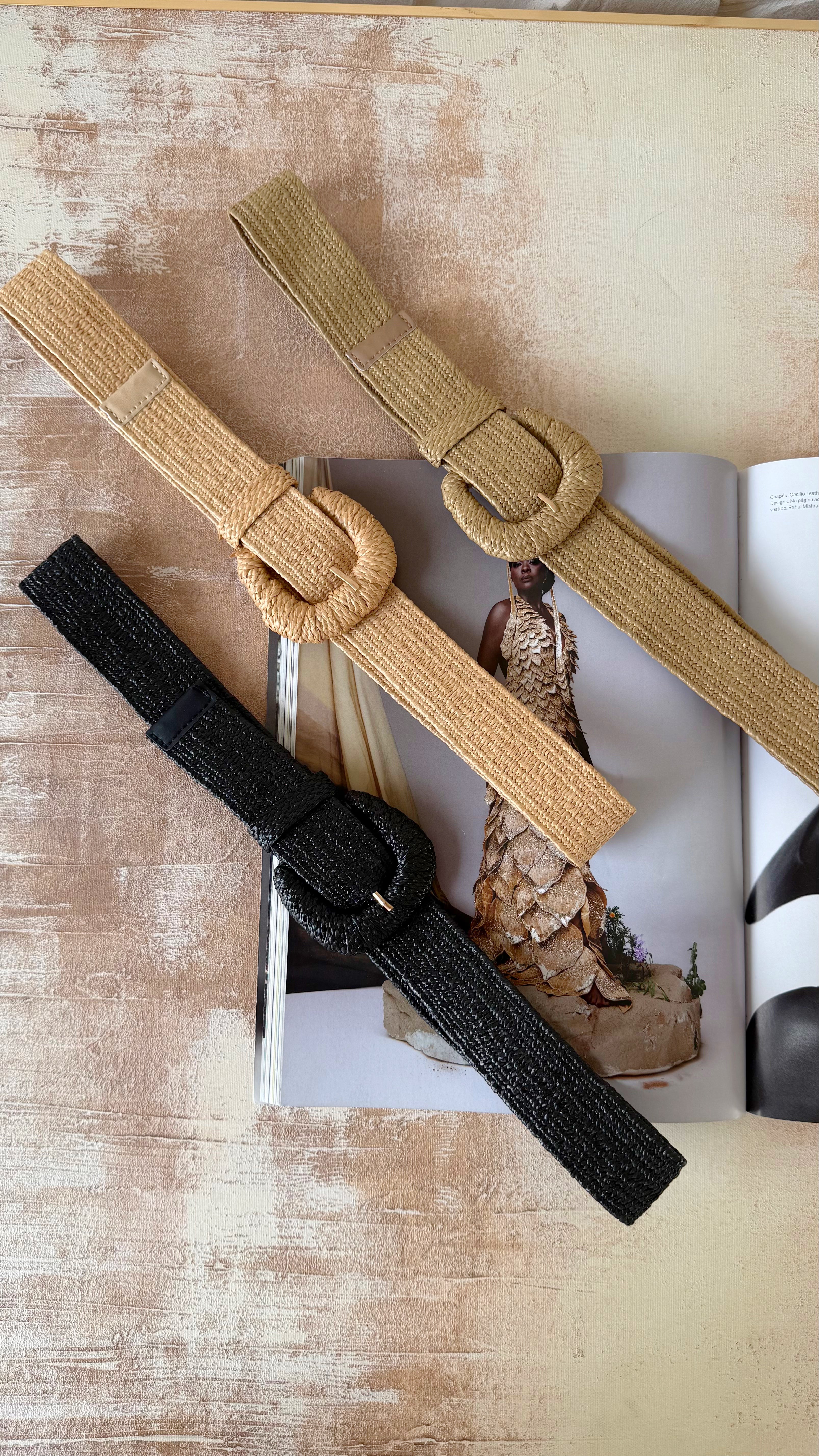 Acabamento em palha sintética trançada com fivela encapada