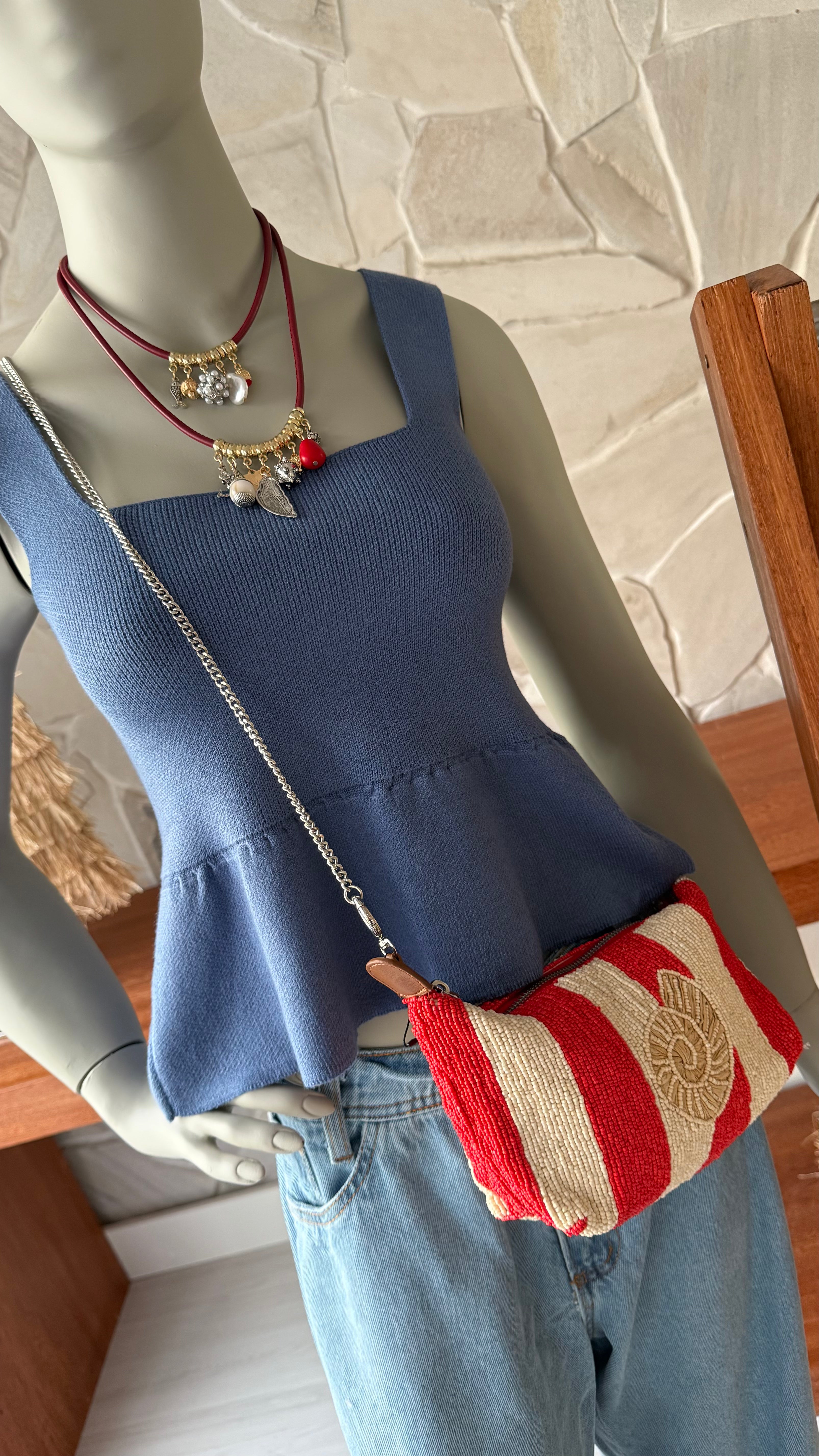 Modelo em tricô com decote quadrado que valoriza o busto.