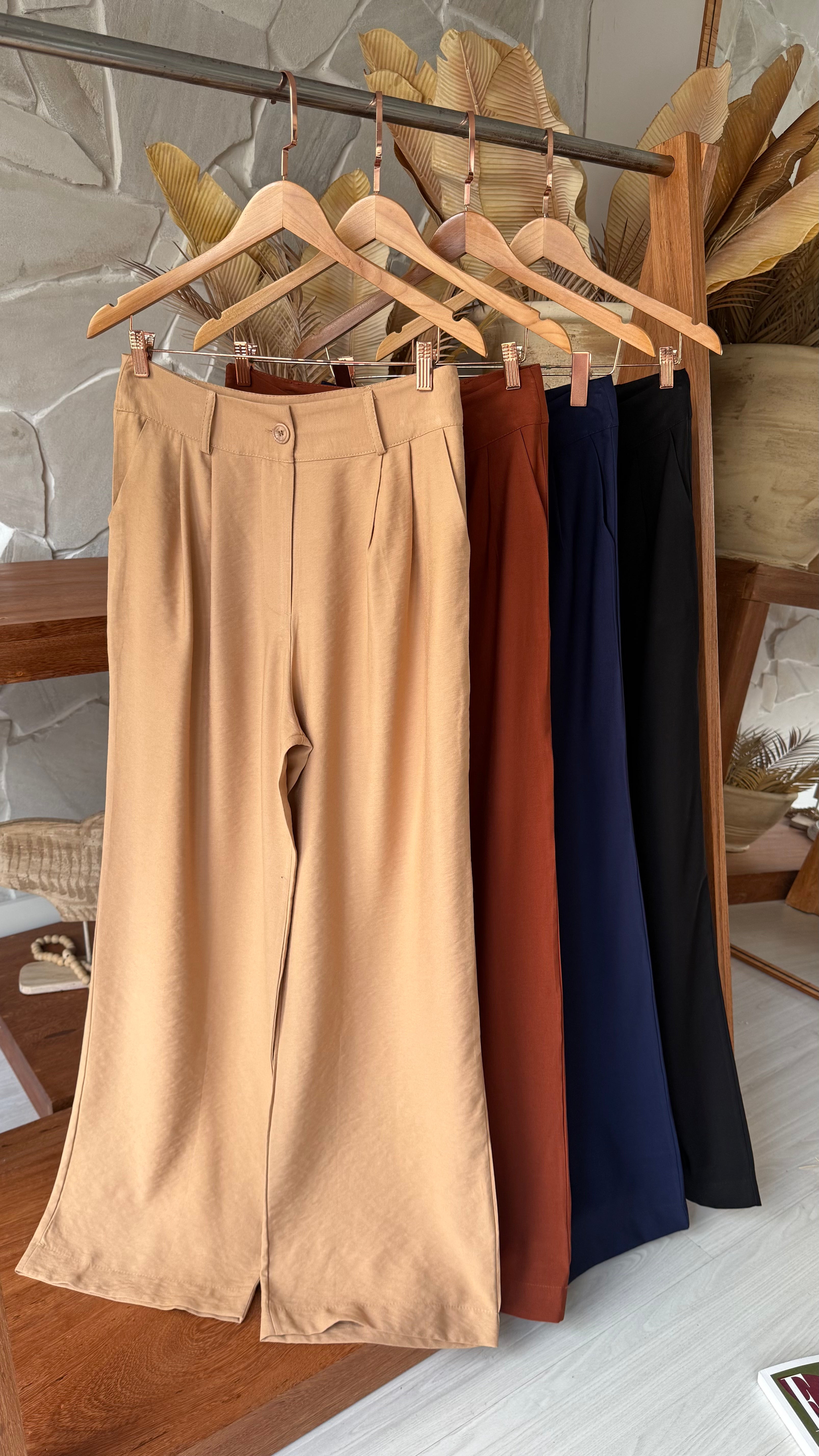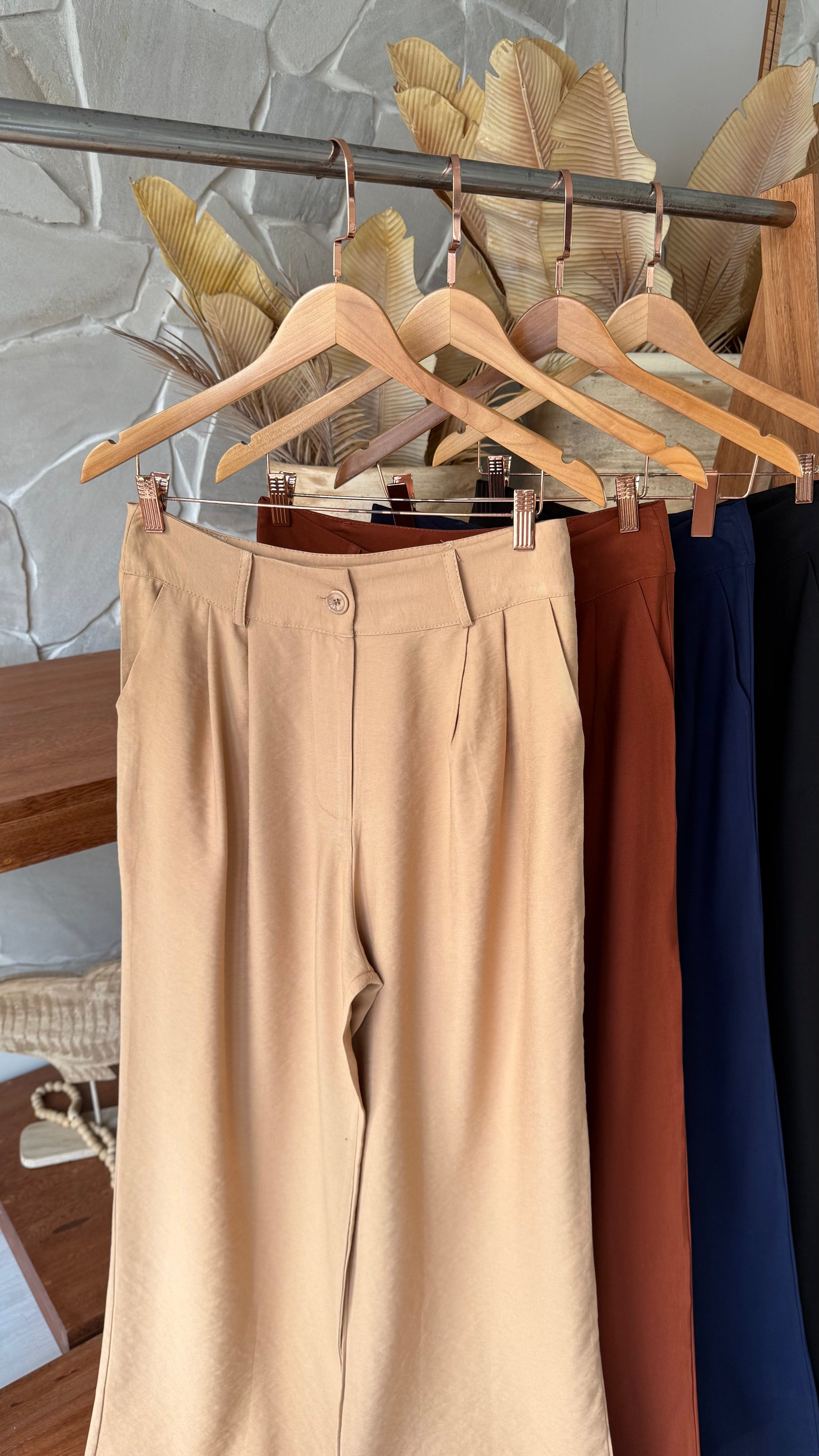 Modelo cintura alta com bolsos faca, tecido leve e fresco, caimento sofisticado que dá elegância e estilo.