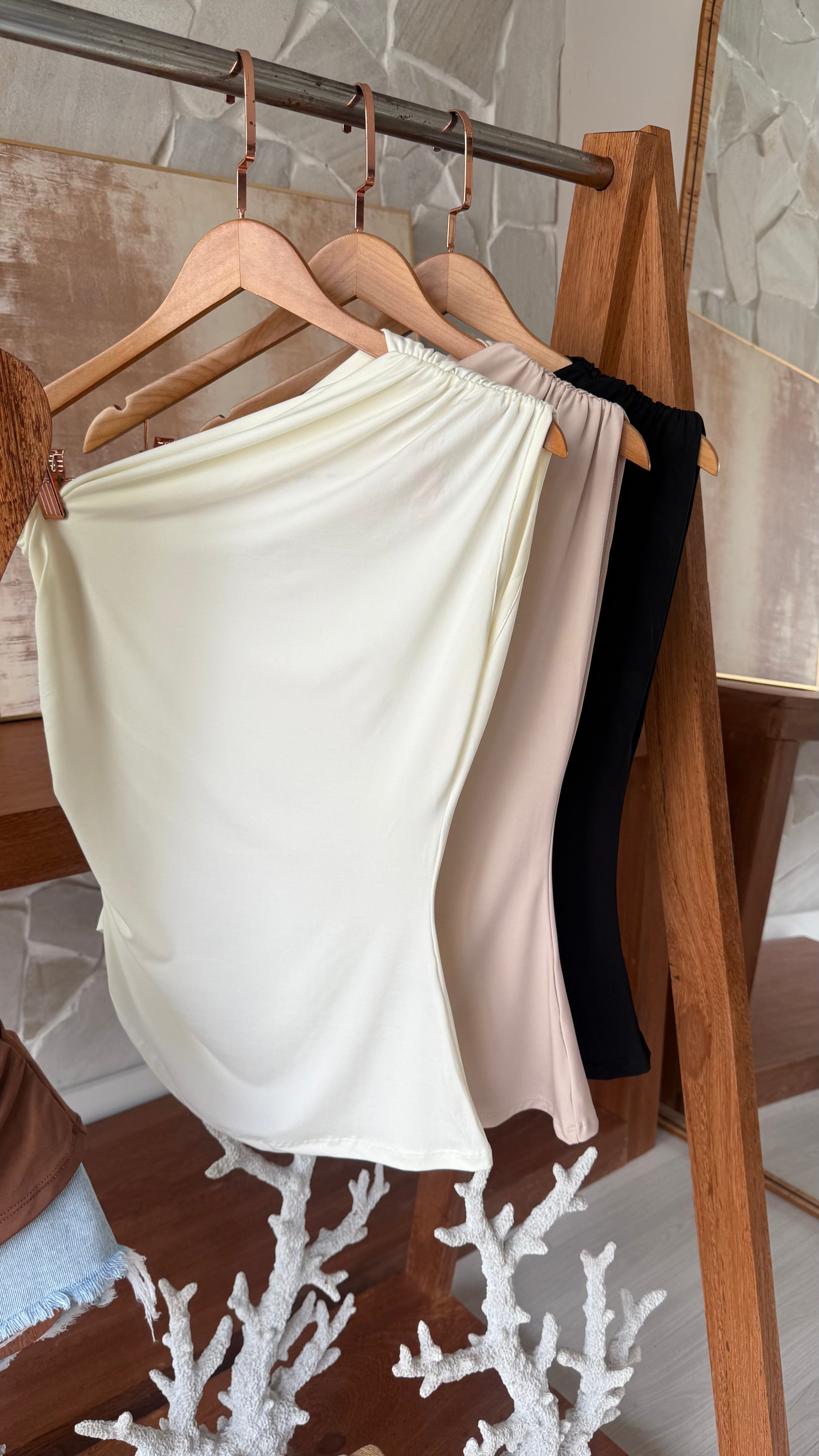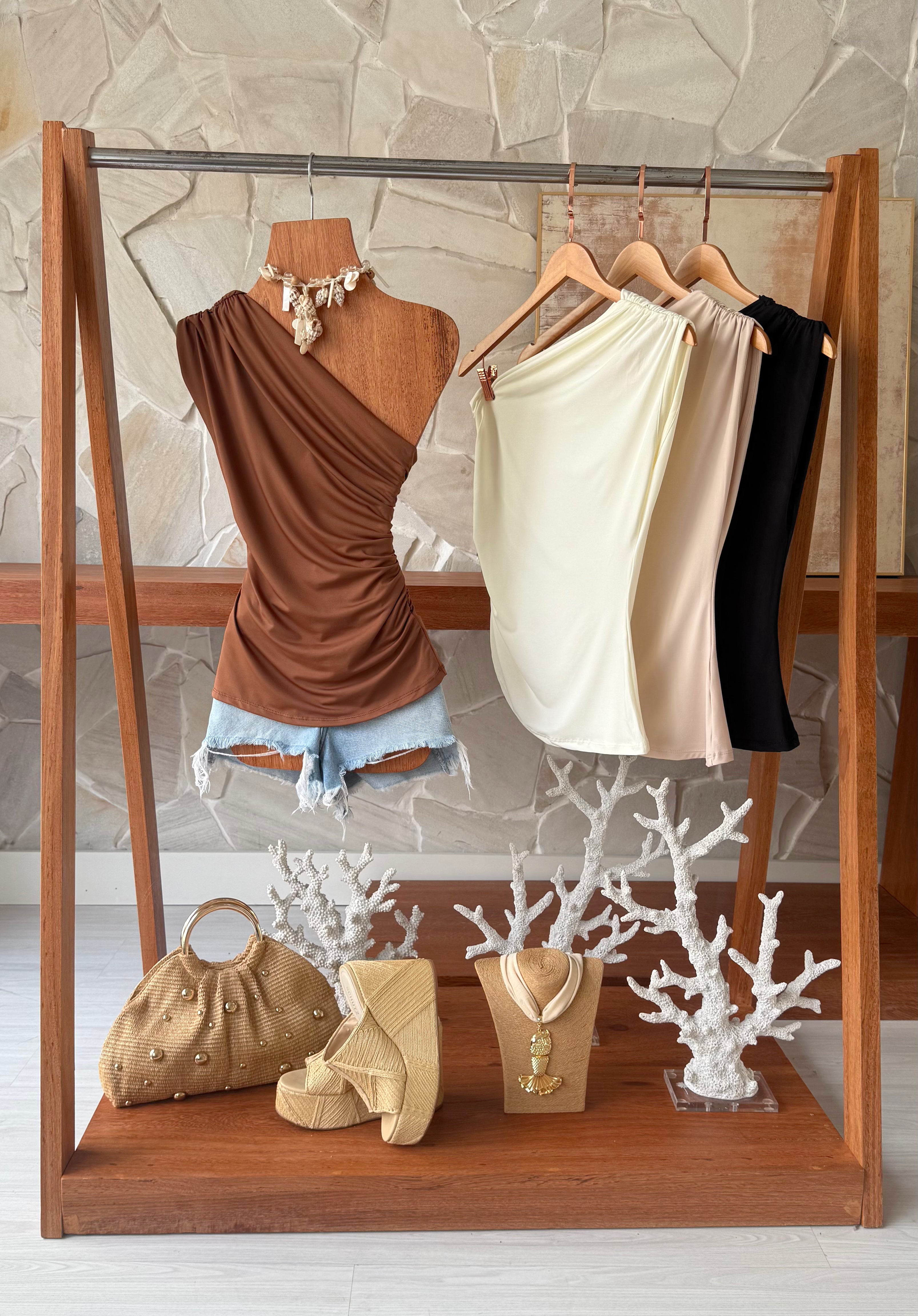 Blusa Moderna e elegante com modelagem ajustada e detalhe drapeado. Tecido leve e confortável.