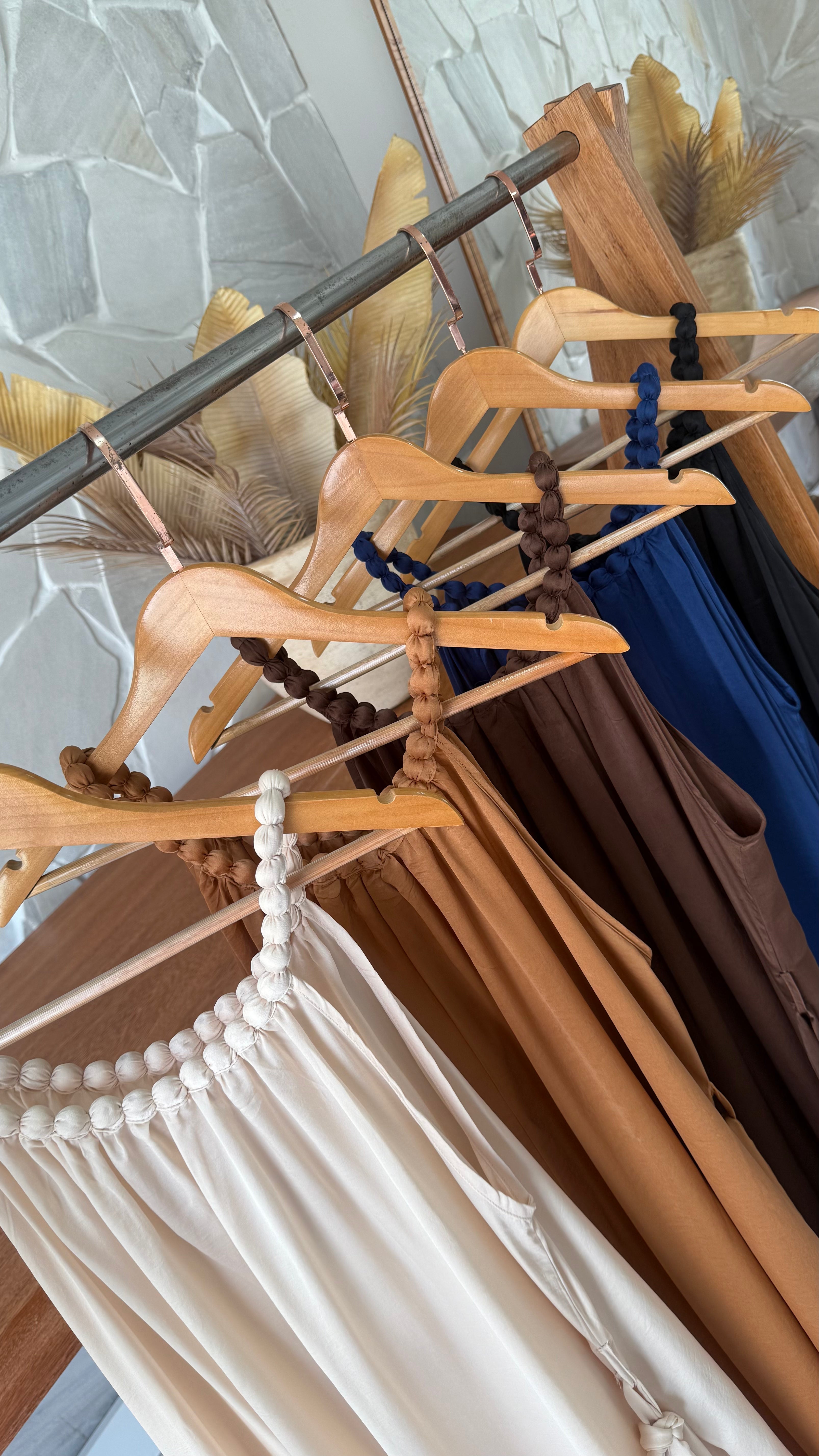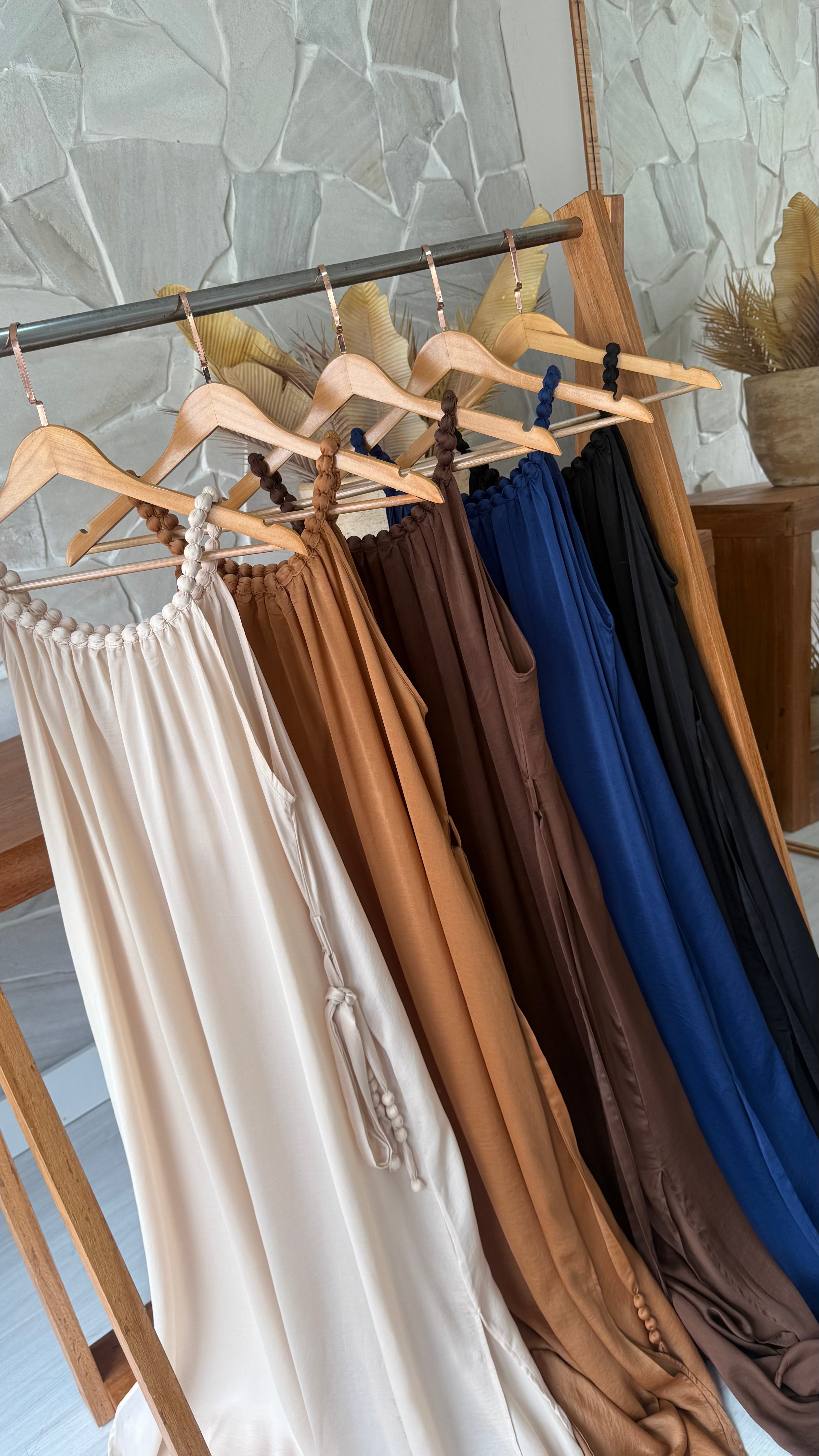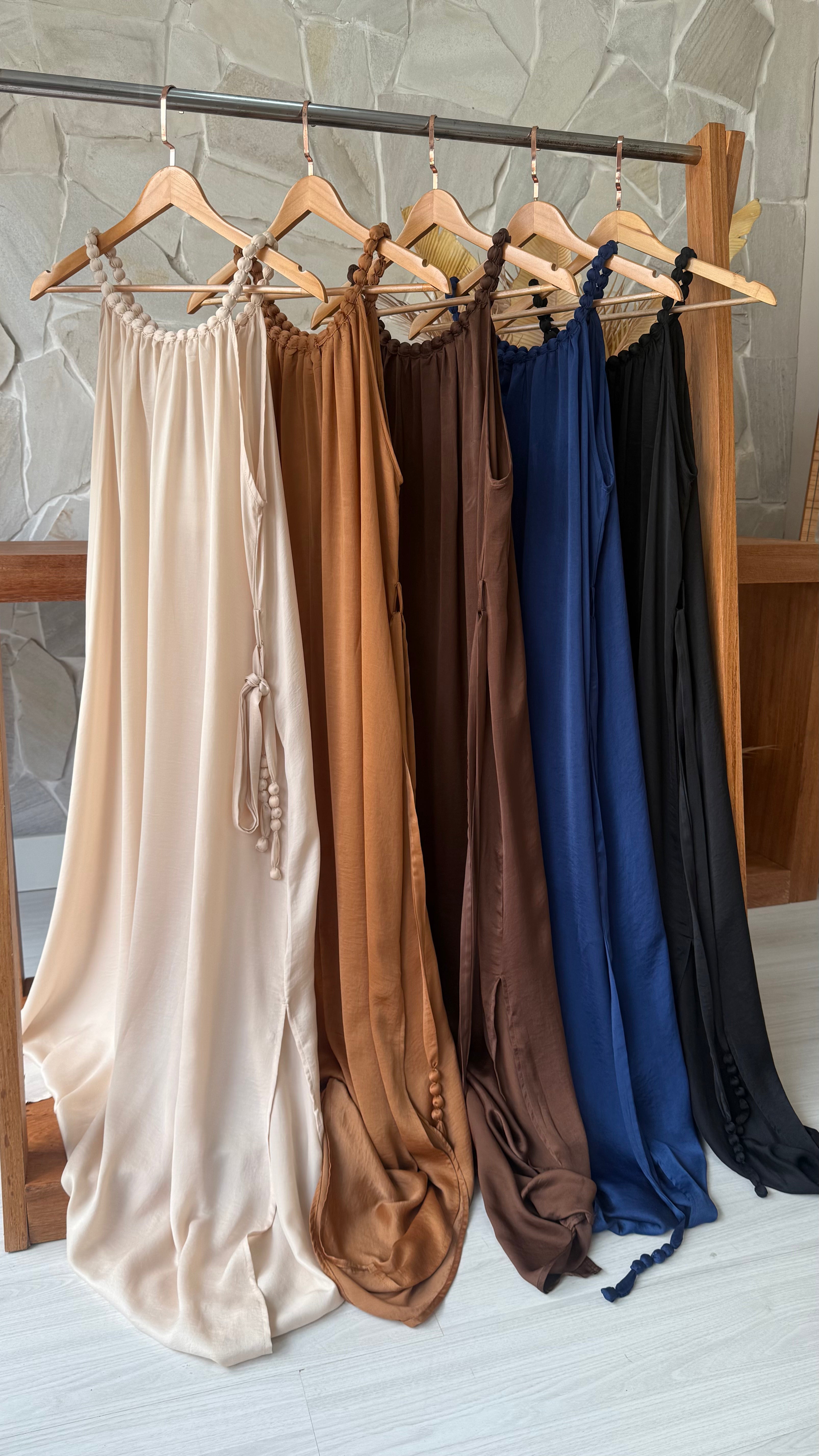 Modelo longo, alça e gola com aplicação amadeirado encapado, tecido leve, fluido trazendo estilo e sofisticação para peça. Acompanha cinto para ajuste.
