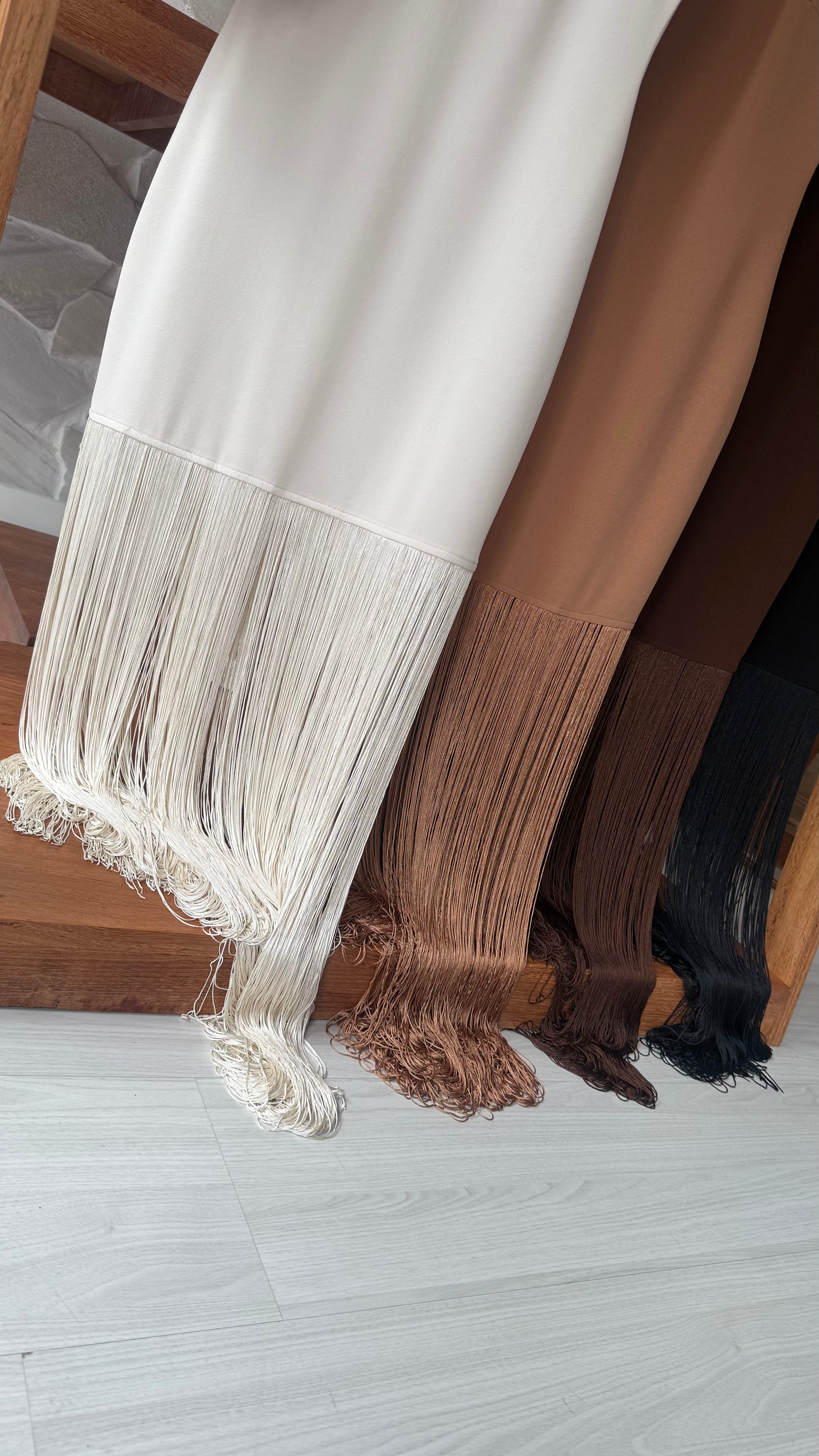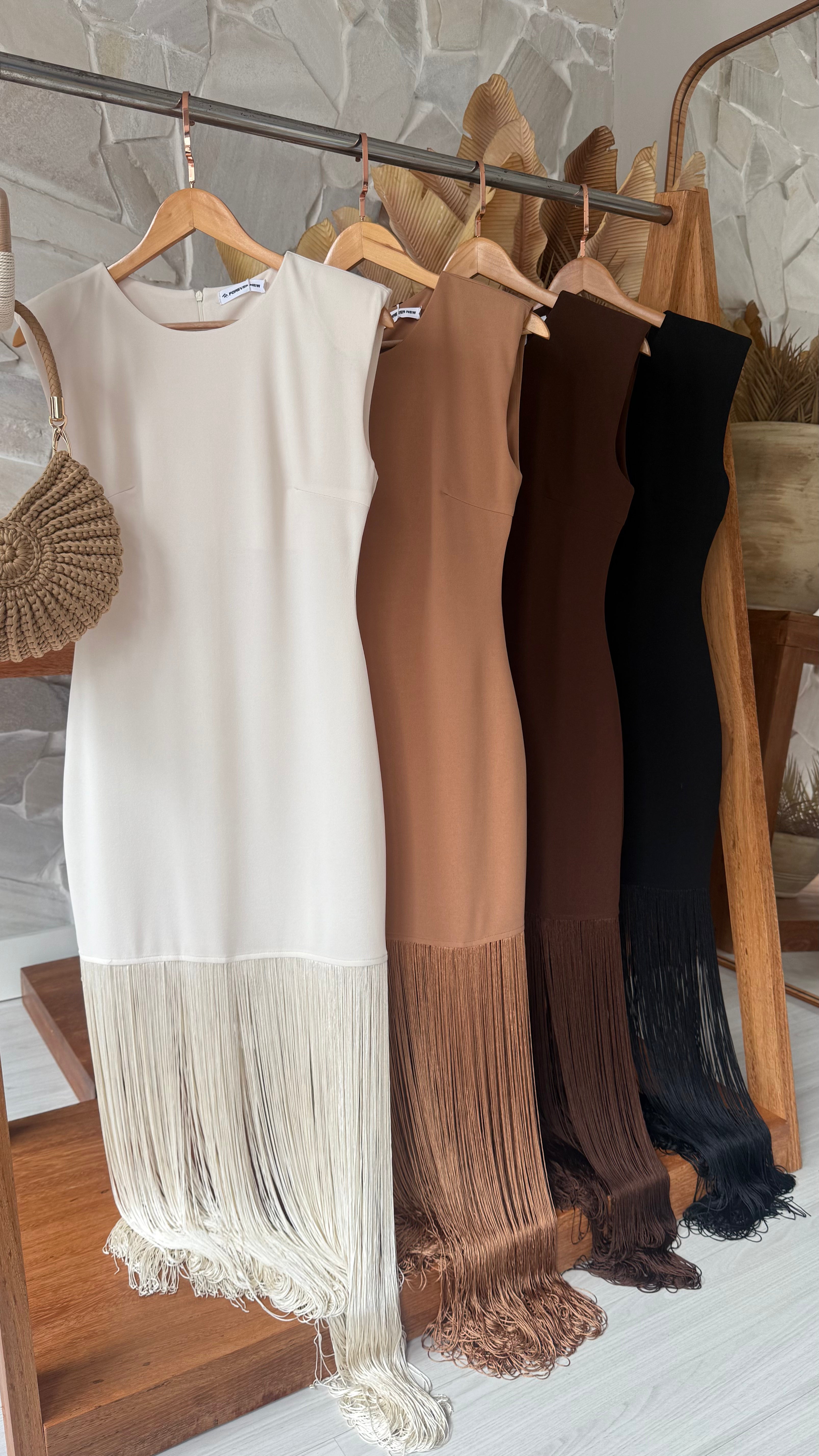 Vestido em MALHA especial com toque aveludado que faz toda a diferença. Modelo muscle, fechamento em ziper nas costas, caimento que valoriza todos os corpos, é a franja na parte inferior sendo o toque final, peça perfeita para quem ama estar bem-vestido sem abrir mão do conforto. Ideal para compor looks casuais com muito estilo.